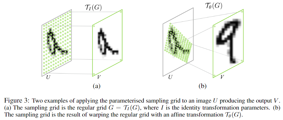 위와 같이 변환 \({\mathcal{T}}_\theta\)는 더 제한적(constrained)일 수 있는데, 다양한 \({s}, {t}_x, {t}_y\)의 값 변화에 따라 cropping, translation, isotropic scaling과 같은 변환 효과를 얻을 수 있다. 이 parameter가 8개가 되면 평면에 projection시키거나 piece-wise 아핀 변환, thin plate spline과 같이 조금 더 일반적인 변환도 할 수 있다. 앞선 내용들을 정리하면, 변환에 사용되는 parameter들이 어떻게 설정되냐에 따라 다양한 변환을 표현할 수 있고 이 parameter들이 미분가능하도록 구현하면 backpropagation을 통해 localisation network 출력 \({\theta}\)를 학습을 할 수 있다는 것이다. 예를들어 attention, affine, projection, thin plate spline 변환들이 표현 가능한 일반적이면서도 미분가능한 변환 \({\mathcal{T}}_\theta = M_{\theta}B\)가 있을 때, \({B}\)는 \({(1)}\)번 식에서 G와 동치로 target grid를 의미하며 \({M_\theta}\)는 \({\theta}\)로 parametrized 된 행렬이다. 이 경우에 입력 데이터에 대해서 \({\theta}\)를 학습을 할 수 있고, 작업의 종류에 따른 \({B}\) 행렬도 학습할 수 있다.