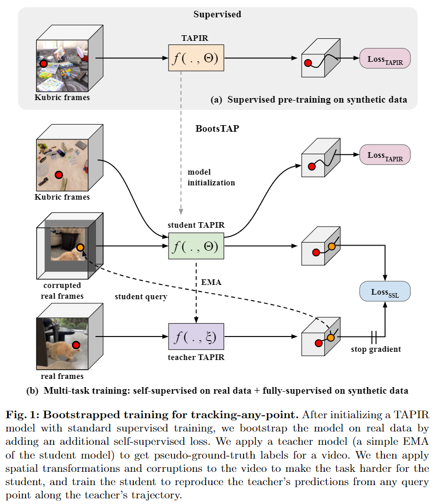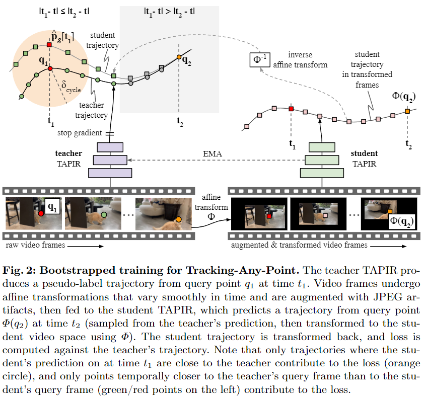 self-training TAP을 개발함에 있어서 저자는 optical flow와 비슷하게 TAP도 query point들에 대한 정확한 정답이 존재한다는 점에 주목했다. 이는 의미적으로 비슷한 이미지가 비슷한 표현을 갖는 한, 다른 self-supervised 방법론과는 구분되는 특징이다.