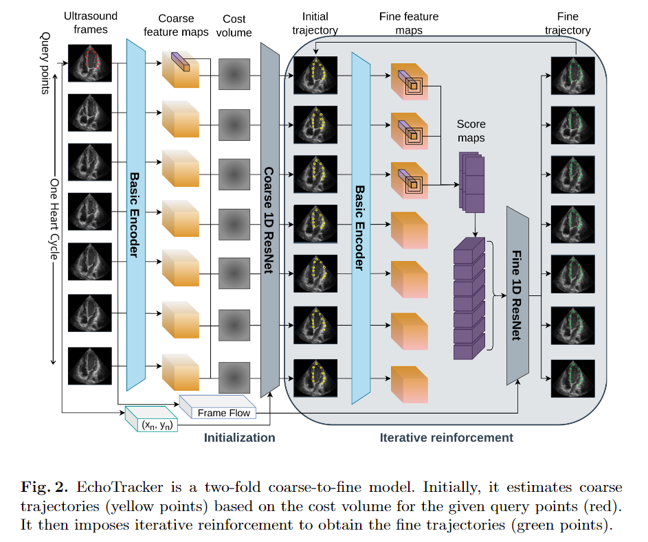 - 모델은 최초의 track을 모두 query point \(P_t := (x_{t_q}, y_{t_q}), t = 1, \ldots, T\) 로, confidence와 visibility는 0으로 초기화( \(\mathcal{C}_t := 0\) , \(\mathcal{V}_t := 0\) )하며, 이후에 iterative하게 update함