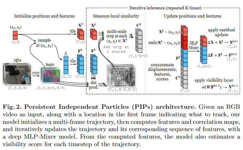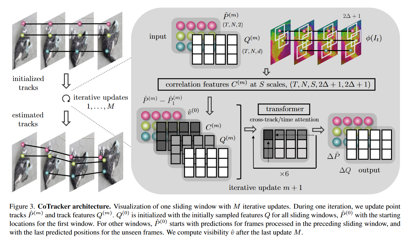 모든 시간 \({t=1, \cdots, T}\)에 대해서 Confidence \(\mathcal{C}_t\)와 Visibility \(\mathcal{V}_t\)는 0으로, tracks \(\mathcal{P}_t\)는 최초의 query point \(\mathcal{Q}\) 좌표로 초기화한다. 이후에 위와 같은 값들을 모두 Transformer에 입력으로 사용하는 iterative한 update 과정을 거친다.