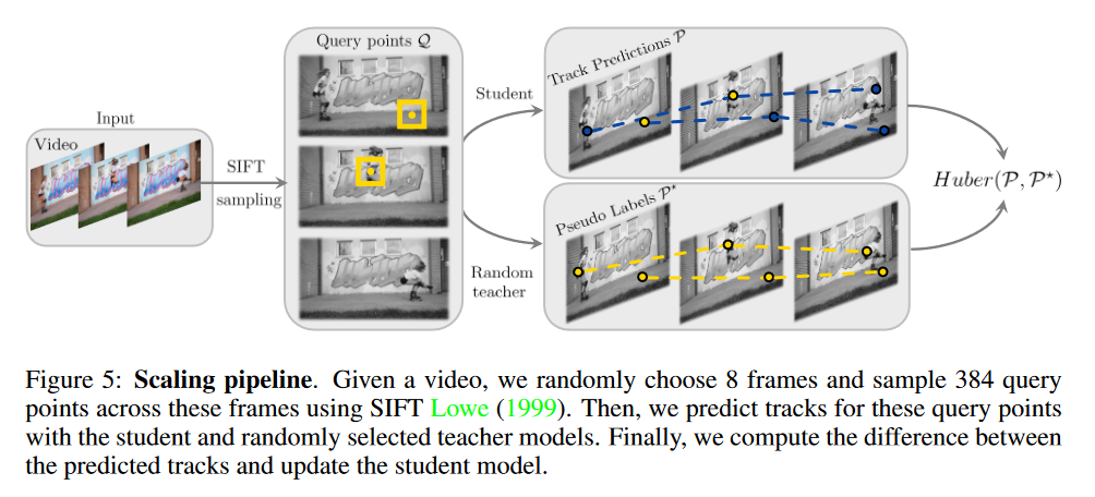 이 모델은 Self-Supervised Learning 방식으로, Annotation이 없는 실제 비디오를 Pseudo 레이블을 사용하여 학습에 활용한다. 또한, 기존 CoTracker 모델구조에서 불필요하거나 복잡한 구성 요소를 제거해 더 간단하고 작은 아키텍처를 구현하며, 1,000배 적은 데이터를 사용하면서도 더 나은 결과를 얻을 수 있다고 주장한다.