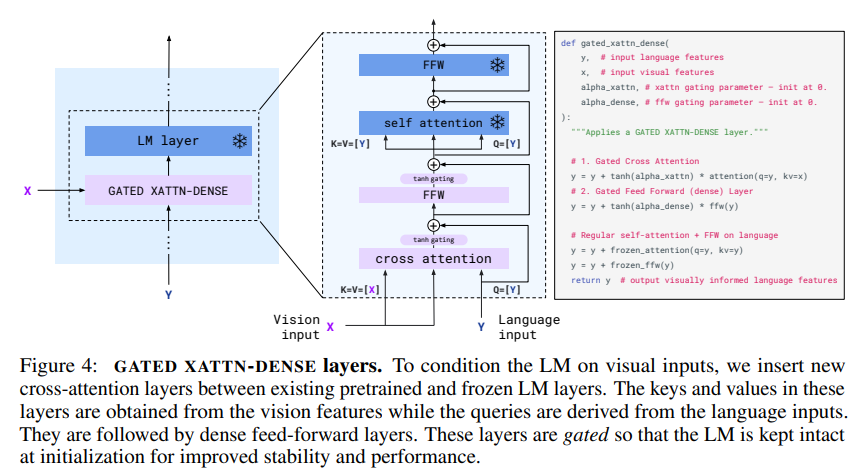 • Perceiver Resampler에서 생성한 Vision feature(X)을 Key, Value로 사용하고 Language input(Y)을 Query로 하는 Cross-Attention layer을 통해서 시각적 정보와 언어적 정보를 통합함