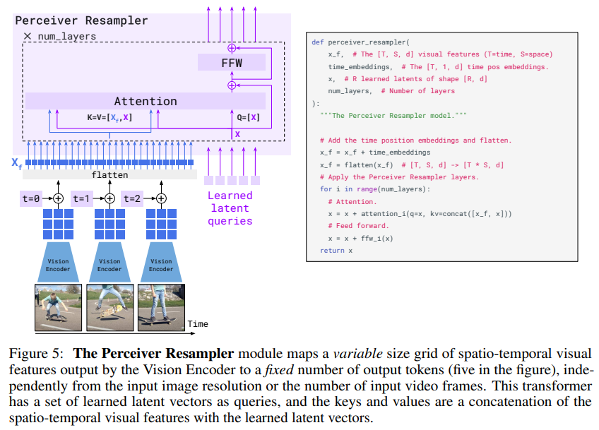 • 위 Figure 5의 예시를 보면, 비디오 데이터의 각 프레임은 Vision Encoder를 통과하여 feature map을 만들게 되고, 이 프레임들의 시간 정보를 유지하기 위해 temporal embedding 값을 더해준 다음 flatten 한 토큰을 learned latent queries와 concat한다. 이를 Perceiver Resample 내의 attention에서 Key와 Value로 사용하게 되고, learned latent queries는 Query가 되어 연산하게 된다.